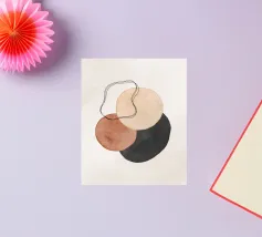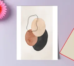 Aggiungete un tocco di fascino minimalista al vostro spazio con questa vibrante stampa d'arte astratta moderna di metà secolo, caratterizzata da un'ipnotica miscela di forme geometriche e fluide di acquerello su uno sfondo neutro morbido e cremoso. Con la sua calda atmosfera scandinavo-giapponese, non è solo arte: è un'atmosfera.