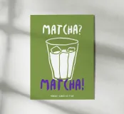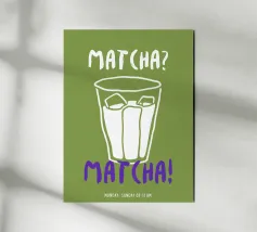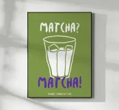 Una stampa tipografica audace e giocosa realizzata per gli amanti del matcha. Caratterizzato da un'illustrazione dalle linee pulite di un bicchiere di matcha ghiacciato su uno sfondo verde oliva intenso, questo design combina caratteri bianchi e viola vivaci per un contrasto sorprendente e moderno. Il titolo ripetuto "Matcha? Matcha!" crea un'atmosfera divertente ed energica, mentre il dettaglio "Lunedì-Domenica 08-11" aggiunge un tocco affascinante ispirato alle caffetterie. Perfetto per cucine, bar, angoli colazione o caffetterie alla moda che cercano un elemento grafico di grande impatto.