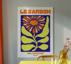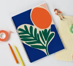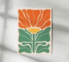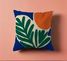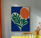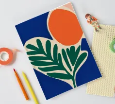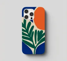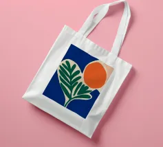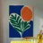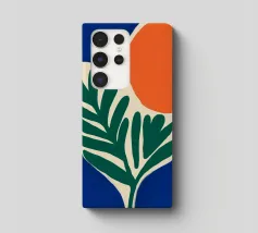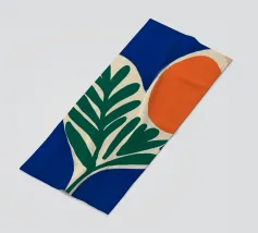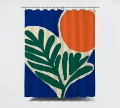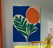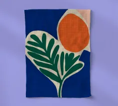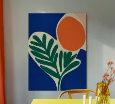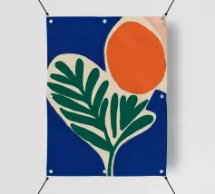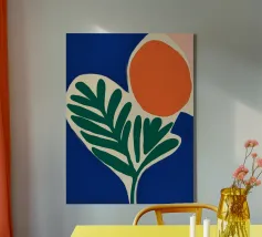 Forme audaci e colori vivaci creano una composizione di grande impatto con una foglia verde e un cerchio arancione. Su uno sfondo blu intenso, il disegno è moderno e astratto al tempo stesso.