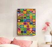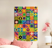 Un motivo complesso e vivace composto da una griglia di piastrelle geometriche, ognuna con un disegno e una combinazione di colori unici, che creano una matrice visiva sorprendente.