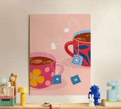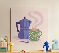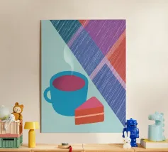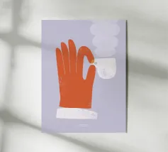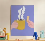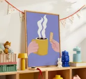 Un'illustrazione semplice e confortante di una mano che tiene una tazza gialla e calda di caffè o tè fumante, con un biscotto pronto per essere inzuppato. L'immagine cattura perfettamente il piacere semplice e tranquillo di un rituale mattutino.