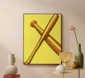 Questa dettagliata illustrazione di attrezzature sportive classiche presenta autentiche venature del legno e raffinati dettagli intagliati.