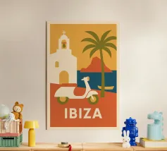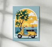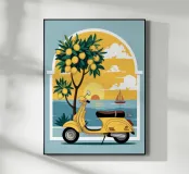 Uno scooter giallo è parcheggiato davanti a uno scenografico paesaggio mediterraneo con alberi di limone, una barca a vela e un cielo blu brillante, che evoca un senso di avventura e relax.