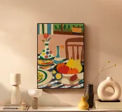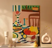 Una vivace scena culinaria in stile mediterraneo, ricca di ceramiche decorate, frutta fresca e colori caldi.
