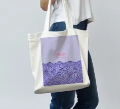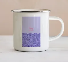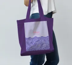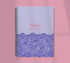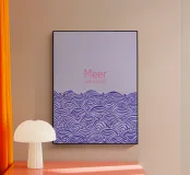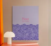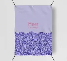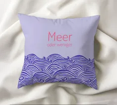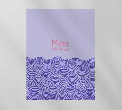 Raffigurazione di onde e mare in stile silhouette su sfondo viola. Sopra, la scritta in rosa: Meer oder weniger (Mare o meno).