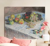 Un'affascinante natura morta del maestro impressionista Claude Monet, che mette in mostra la tranquilla eleganza degli oggetti quotidiani Presenta una disposizione rustica di mele e uva su un tavolo rivestito di bianco, immerso in una morbida luce naturale Cattura la bellezza fugace della frutta matura con pennellate sciolte e tonalità calde e autunnali Un'opera intima che si discosta dai famosi paesaggi di Monet e che è stata dipinta in casa durante il maltempo. Un'opera d'arte senza tempo e rilassante, perfetta per cucine, sale da pranzo o qualsiasi altro interno accogliente Regalo ideale per gli amanti dell'arte, per i cuochi o per chi apprezza l'estetica rustica e la natura morta