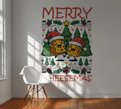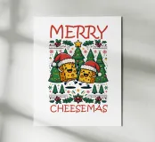 Due allegri personaggi di formaggio con cappelli da Babbo Natale sono circondati da alberi di Natale e decorazioni festive. Il testo "Merry Cheesemas" è scritto in grassetto a caratteri rossi.
