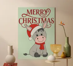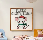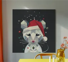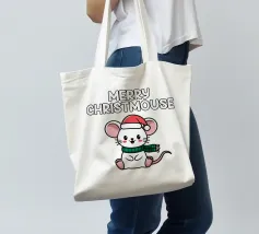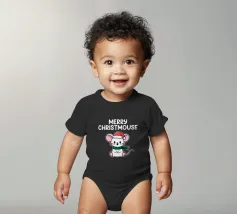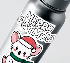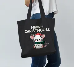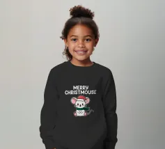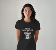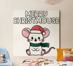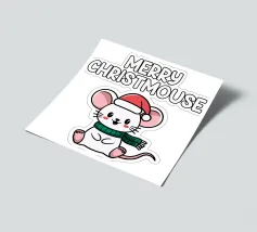 Un simpatico topo con un cappello da Babbo Natale e una sciarpa verde siede sotto la frase "Merry Christmouse".