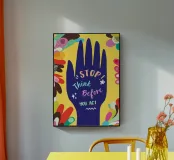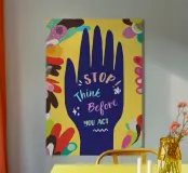 Condividete un messaggio di consapevolezza con questa stampa digitale "Stop Think Before You Act". Questa vibrante illustrazione contemporanea presenta un'audace mano blu scuro che funge da spunto visivo, sovrapposta al chiaro e importante messaggio di testo. Circondato da una vivace serie di forme astratte colorate su uno sfondo giallo sole, il disegno è allo stesso tempo sorprendente e positivo. Questo messaggio grafico è perfetto per incoraggiare la consapevolezza e l'azione riflessiva in qualsiasi spazio. Questa riproduzione digitale di alta qualità vanta una risoluzione di 7000x5000 pixel a 300 dpi, che garantisce chiarezza e brillantezza eccezionali.