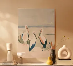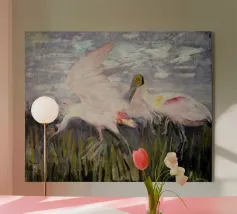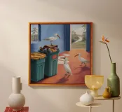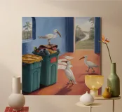 Due uccelli bianchi, forse gabbiani, si trovano in mezzo a uno spargimento di buste accanto a bidoni verdi in riva al mare. Il dipinto giustappone la bellezza naturale degli uccelli e della costa con il disordine prodotto dall'uomo, creando una narrazione della vita di mare.