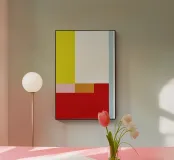 Questa stampa d'arte astratta presenta una vivace combinazione di colori rossi, gialli e pastello. Le forme geometriche si uniscono per creare un quadro d'insieme potente ma armonioso. L'azzurro sul lato destro crea un effetto di equilibrio, mentre i colori caldi nella parte inferiore irradiano energia e calore. Quest'opera d'arte moderna è ideale per aggiungere un tocco di colore alla casa o all'ufficio.