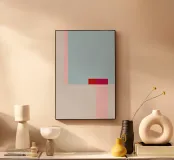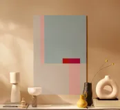 Questa stampa d'arte minimalista presenta un'armoniosa interazione di delicati colori pastello, combinati con un'intensa tonalità di rosso e rosa come accento. Le forme geometriche chiare e la tavolozza di colori pacati creano un'atmosfera elegante e moderna che può essere integrata in un'ampia varietà di spazi abitativi. In camera da letto, in ufficio o in soggiorno, quest'opera d'arte darà un tocco morbido e contemporaneo alla vostra casa.
