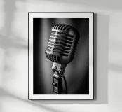 Visualizzazione in bianco e nero di un microfono vintage in stile anni '50, con finitura metallica e griglia cromata su uno sfondo sfocato. Dettagli precisi, riflessi lucidi e linee arrotondate creano un'atmosfera retrò, jazz e rock, ideale per gli appassionati di musica. Questo poster da parete aggiungerà carattere a qualsiasi salotto, ufficio, studio di registrazione o bar. Perfetto per un arredamento industriale, loft o minimalista; un regalo elegante per musicisti e podcaster.