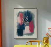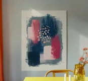 I toni del blu profondo e del fucsia incontrano delicate texture di pennelli e giocosi punti bianchi. Un equilibrio sorprendente tra movimento e immobilità, un pezzo forte per gli amanti dell'arte contemporanea.