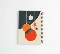 Una composizione natalizia contemporanea ispirata al design di metà secolo, con ornamenti appesi a strati e stelle a raggiera sospese in un tranquillo spazio invernale. I rossi e gli arancioni caldi contrastano con il carbone profondo e l'avorio morbido, mentre le texture granulose aggiungono calore e tattilità. Questa disposizione equilibrata evoca celebrazioni, gioia tranquilla ed eleganza festiva senza tempo, perfetta per moderni poster natalizi, biglietti d'auguri di qualità, stampe di grande formato e decorazioni d'interni eleganti.
