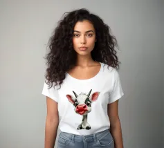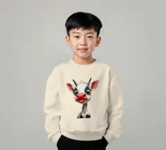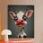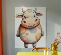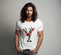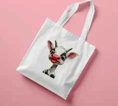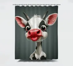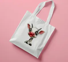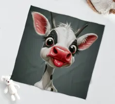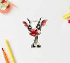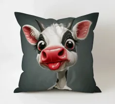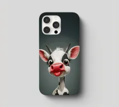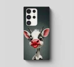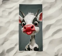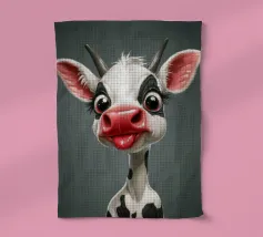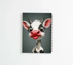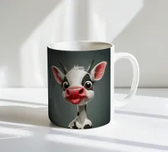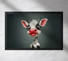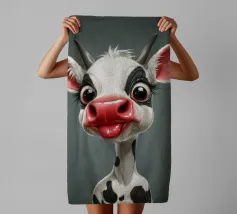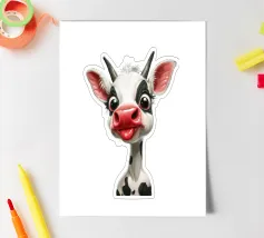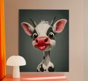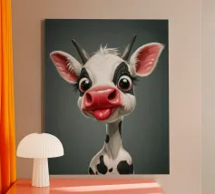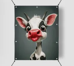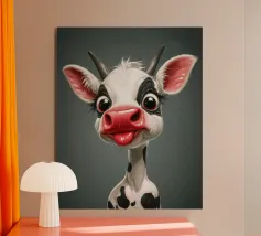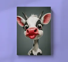 Illustrazione stravagante di una mucca dei cartoni animati con grandi occhi espressivi, macchie in bianco e nero, naso rosa e lingua che fuoriesce, creando un'atmosfera umoristica e allegra.
