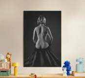 Una ripresa di nudo artistico di una vista posteriore di Mina, seduta su materiale
