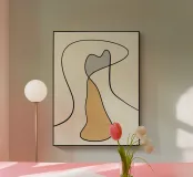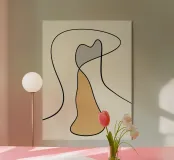 Linee e forme geometriche astratte creano una composizione minimalista dai toni neutri. Linee nere curve delineano due sezioni distinte, una riempita di grigio e l'altra di beige.