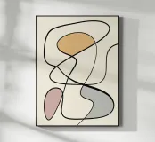 Forme e linee astratte si intrecciano in una composizione minimalista dai colori tenui. Il design presenta curve morbide e un equilibrio armonioso di forme su uno sfondo neutro.