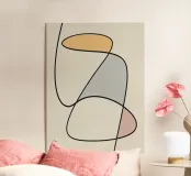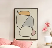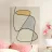 Forme astratte in colori tenui sono collegate da sottili linee nere, creando un design minimalista. Le forme includono toni morbidi di giallo, grigio e rosso, su uno sfondo beige neutro.