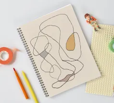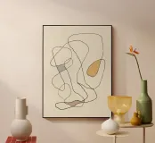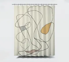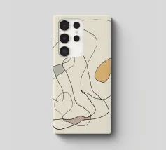 Linee astratte si intrecciano su uno sfondo chiaro, con spruzzi di colori tenui come il grigio, il giallo e il marrone che aggiungono una sottile profondità. Il design minimalista evoca un senso di calma e semplicità.