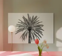 Questo motivo minimalista a forma di palma in bianco e nero dona serenità tropicale a qualsiasi ambiente. La palma solitaria su uno sfondo chiaro trasmette una sensazione di libertà e di estate e si adatta perfettamente a un arredamento moderno e minimalista. Ideale come murale, cuscino o cover per cellulare, questo disegno aggiunge un tocco di esotismo e relax a qualsiasi stanza. Per tutti coloro che desiderano un'atmosfera tropicale nella propria casa e apprezzano la semplice eleganza.