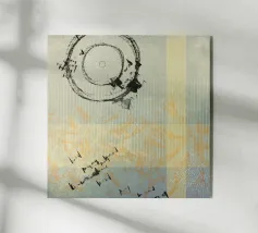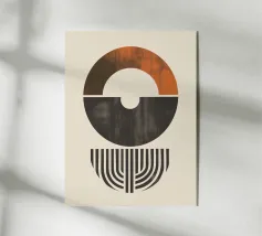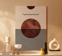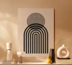 Opera d'arte digitale minimalista con linee nere come pennellate e forme astratte bianche in un cerchio. Disegno astratto in colore blu pastello e sfondo beige per interni boho, minimalisti, industriali o moderni. Se preferite la semplicità e l'eleganza, questa è un'opera d'arte digitale equilibrata.