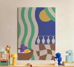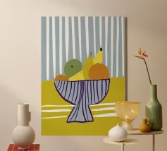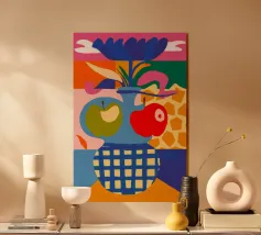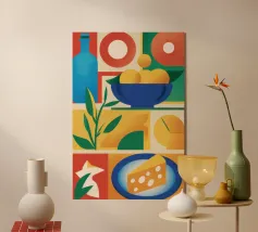 Una composizione minimalista presenta una ciotola con due frutti rossi su uno sfondo a motivi geometrici. I colori vivaci e le forme astratte creano un'immagine moderna e di grande impatto.