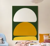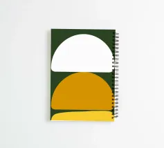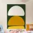 Il design minimalista è caratterizzato da tre forme semicircolari in bianco, senape e giallo impilate verticalmente. L'uso semplice ma deciso del colore e della forma crea un contrasto visivo sorprendente.