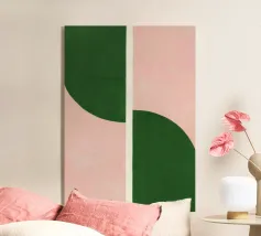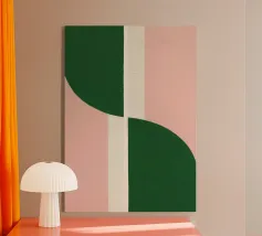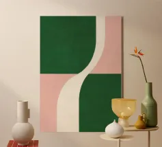 Blocchi di colore minimalisti rosa, verdi e bianchi su uno sfondo color salvia, realizzati con colori acrilici.