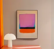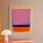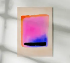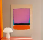 Un dipinto minimale e misterioso con campi di colore, una forma astratta. Lo sfondo è rosa chiaro, mentre il motivo principale è nei toni del viola, dell'arancione, del nero e del blu, creando un contrasto e un equilibrio tra spazio negativo e forma positiva. Vista aerea.