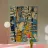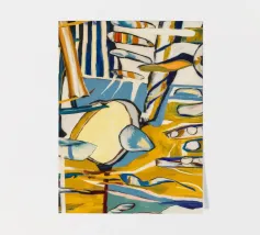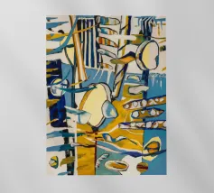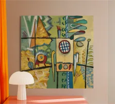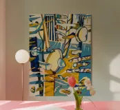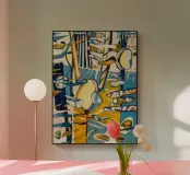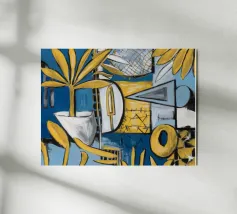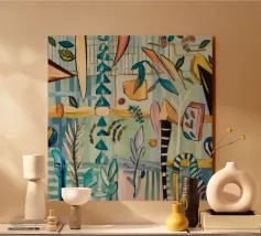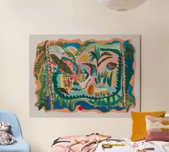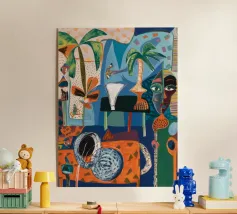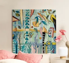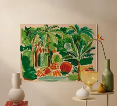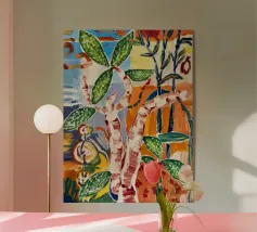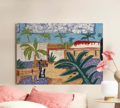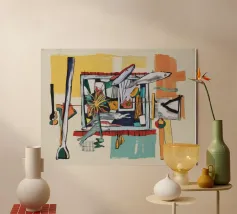 L'opera presenta una scena tropicale con palme, forme astratte e una varietà di colori come il rosa, il blu e il giallo. La composizione è vivace e piena di energia.