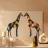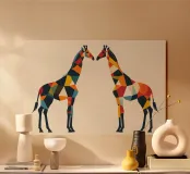 Due vibranti giraffe si fronteggiano in perfetta simmetria, composte da nitidi frammenti geometrici e giocosi blocchi di colore. Una celebrazione della connessione e della dualità, questo pezzo audace e moderno porta l'eleganza del safari in forma astratta. Perfetto per le camere dei bambini contemporanee, per le camerette di design o per gli interni dalla grafica audace.