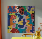 Una composizione astratta giocosa e colorata con una serie di forme organiche simili a blob di varie dimensioni e tonalità. La disposizione stravagante e la tavolozza vibrante creano un senso di gioia spontanea e libertà artistica.