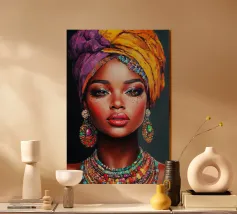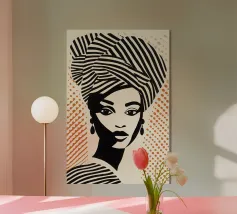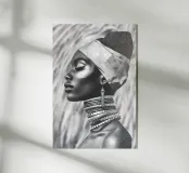 Un suggestivo ritratto in bianco e nero di una donna africana di profilo laterale, adornata da eleganti gioielli, che ne enfatizzano i tratti straordinari. La texture granulosa dell'immagine enfatizza la forza e la bellezza della moda, catturata in uno stile moderno e ipnotico.