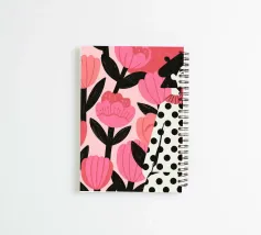 Questa opera d'arte raffigura una persona che indossa un abito a pois, sullo sfondo di grandi fiori rosa. La composizione è audace e alla moda.