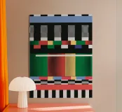 Forme geometriche vibranti e colori decisi creano una composizione dinamica e astratta. Barre e blocchi orizzontali di varie tonalità sono intervallati da motivi a strisce bianche e nere che aggiungono contrasto e ritmo.