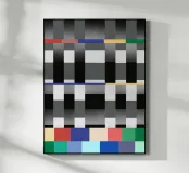 Un motivo geometrico composto da vari rettangoli, con sezioni definite da sfumature di grigio e strisce orizzontali in colori contrastanti come rosso, blu e verde. La disposizione crea un effetto visivo strutturato e vibrante, con i colori che formano una struttura a griglia.