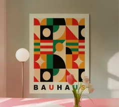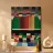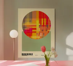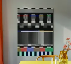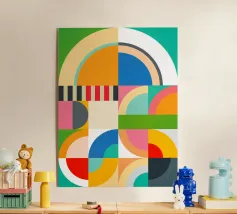 Una composizione di motivi geometrici presenta un cerchio con audaci strisce verticali rosse, gialle e verdi, intersecato da barre orizzontali e circondato da una varietà di rettangoli a scacchi e a tinta unita. Un mix di colori vivaci e tenui, insieme a linee nette, sono i motivi che caratterizzano la composizione.