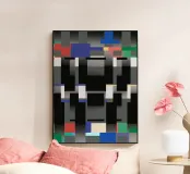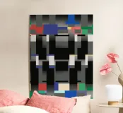 Le forme geometriche formano un motivo pixelato con un mix di nero, grigio e colori vivaci come rosso, blu e verde. Il design ha un'estetica digitale e moderna con linee orizzontali e verticali a contrasto.