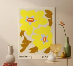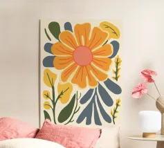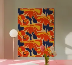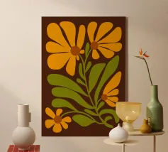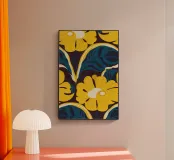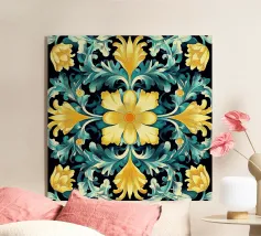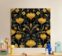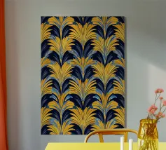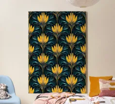 Un motivo audace e lussuoso di grandi fiori stilizzati di colore giallo oro su uno sfondo blu scuro. L'elevato contrasto e le forme eleganti creano un disegno floreale sofisticato e senza tempo.