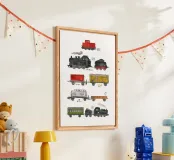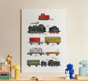 Modellini di treni per la stanza dei bambini e per gli appassionati di modellismo ferroviario - tecnica mista: Acquerelli e matite colorate.