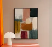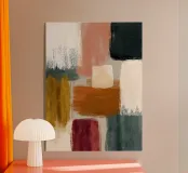 Pennellate materiche in tonalità tortora, senape e vino intenso creano un flusso organico di colore. Un pezzo senza tempo ispirato agli studi d'arte moderna e all'equilibrio naturale.