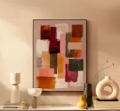 Le forme dinamiche del corallo, del bordeaux e dell'arancio bruciato si fondono con i neutri cremosi. Una dichiarazione vibrante ma equilibrata per interni in stile dopamina.