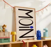 Questo moderno design ispirato alla Bauhaus presenta la parola tedesca MOIN scritta verticalmente in lettere nere con un giocoso punto blu sulla i. La sua geometria pulita e la composizione minimalista lo rendono un pezzo perfetto per gli amanti dell'arte murale contemporanea e tipografica. Un'aggiunta ideale a una galleria da parete con toni blu.