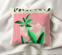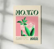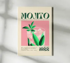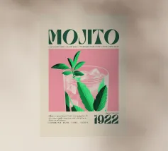 mojito cocktail rum succo di lime zucchero foglie di menta acqua di soda cubetti di ghiaccio bicchiere bevanda bevanda ricetta testo aspetto vintage design botanico illustrazione di foglie tipografia 1922 sfondo rosa istruzione
