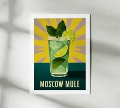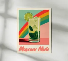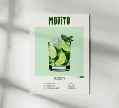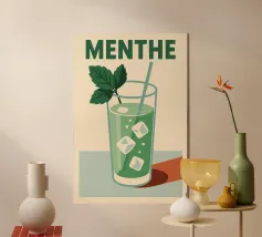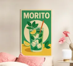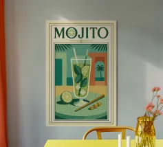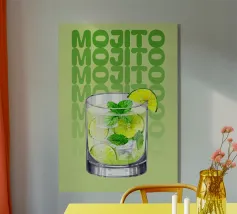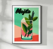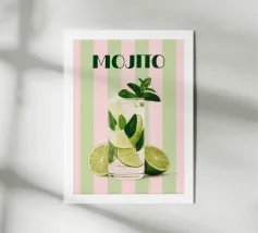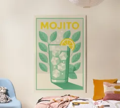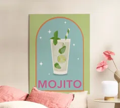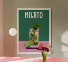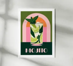 Un'audace illustrazione di mojito con fresche foglie di menta verde che spuntano da un bicchiere alto e due eleganti cannucce nere, su vivaci blocchi geometrici di menta, corallo e pesca. Questa stampa pop-art porta un'atmosfera da bar moderna e divertente in qualsiasi cucina, sala da pranzo o bar di casa.