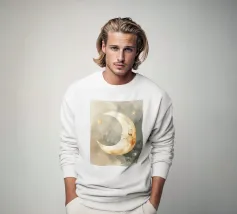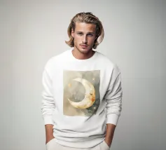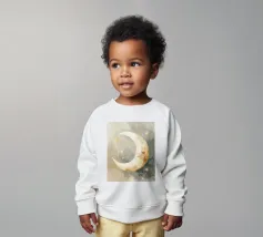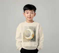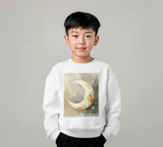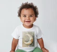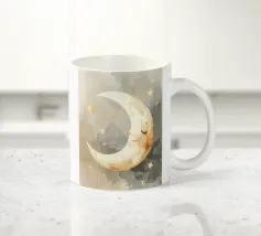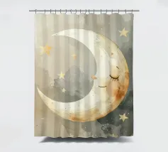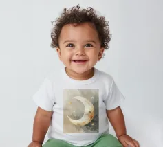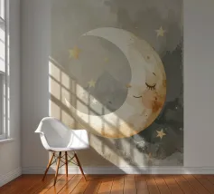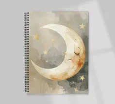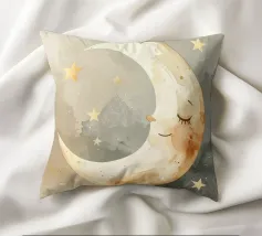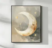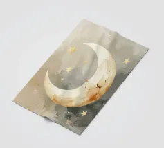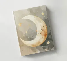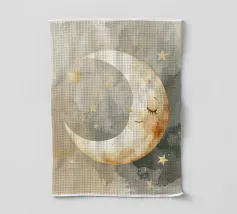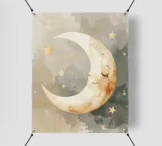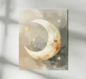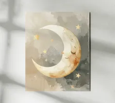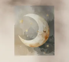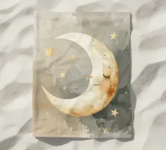 "La pace della luna" Una luna sorridente fluttua dolcemente nella quiete della notte, circondata da stelle scintillanti come desideri silenziosi. Nei toni tenui dell'acquerello, questo motivo racconta la sicurezza, i sogni e la magia dell'addormentarsi. Un disegno che porta pace, abbraccia l'immaginazione e trasforma la stanza in una silenziosa poesia della buonanotte.
