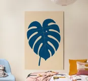 Un'audace rappresentazione astratta di una singola foglia di monstera in blu intenso. Ispirato all'arte del ritaglio e del collage di carta, questo pezzo porta la struttura tropicale e la calma moderna in qualsiasi stanza. Pulito, simmetrico e inconfondibilmente grafico.