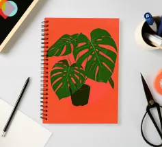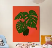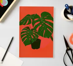 Un'audace illustrazione botanica con rigogliose foglie di monstera su uno sfondo vivace e caldo. Quest'opera d'arte fonde il minimalismo moderno con l'energia tropicale, creando una composizione sorprendente ma equilibrata. Perfetta per interni contemporanei, aggiunge freschezza, colore e un tocco di design deciso a soggiorni, uffici o spazi creativi.